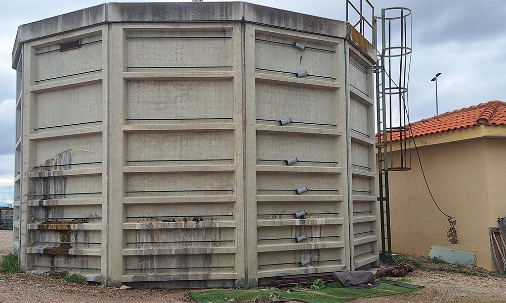 Reparar e impermeabilizar un depósito de agua potable por su parte exterior, sin interrumpir su funcionamiento ni vaciarlo. El depósito presentaba grietas, desconchones y vías activas de agua.