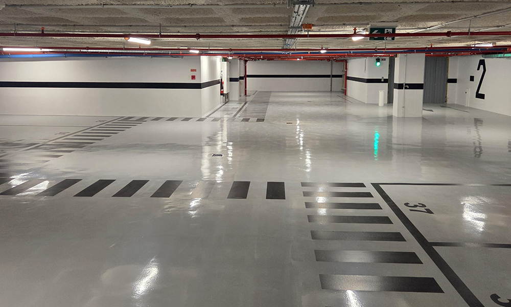ARDEX rehabilitó los 1400 m² del pavimento reparando las zonas dañadas con Ardex Fix y Ardex A38. Se aplicó ADICEM TR para regularizar la superficie con rapidez. Como sistema de resinas, se utilizó SEIREPOX TOP PLUS M como capa epoxi intermedia y SEIREPOX MF en acabado RAL 7040, generando un pavimento resistente, estético y de fácil mantenimiento, ideal para un parking de alta exigencia.